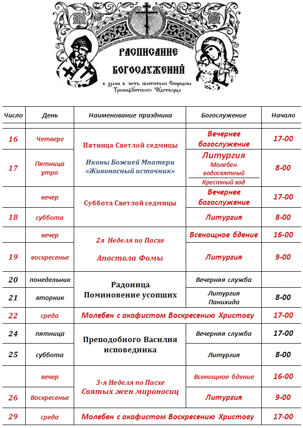 Молебны на Светлых седмиц свт. Спиридону не служатся. Служатся молебны Воскресению Христову.